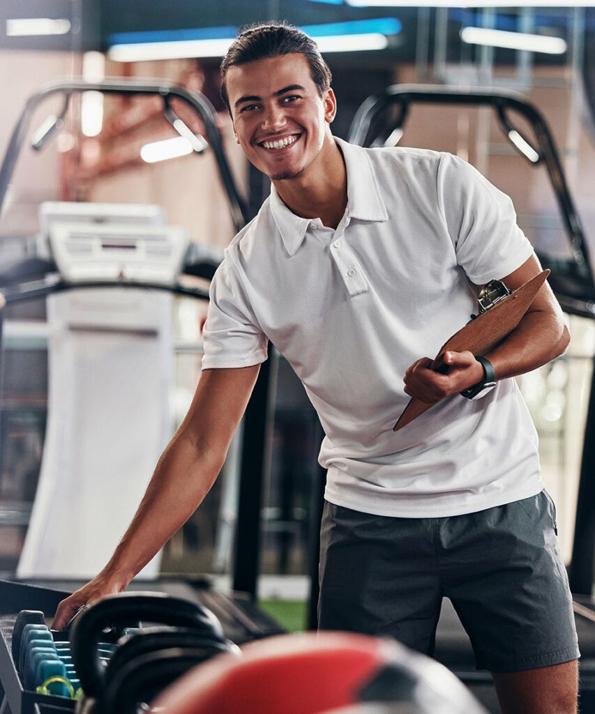 Attractive young muscular man and woman doing plank exercise while working out in gym